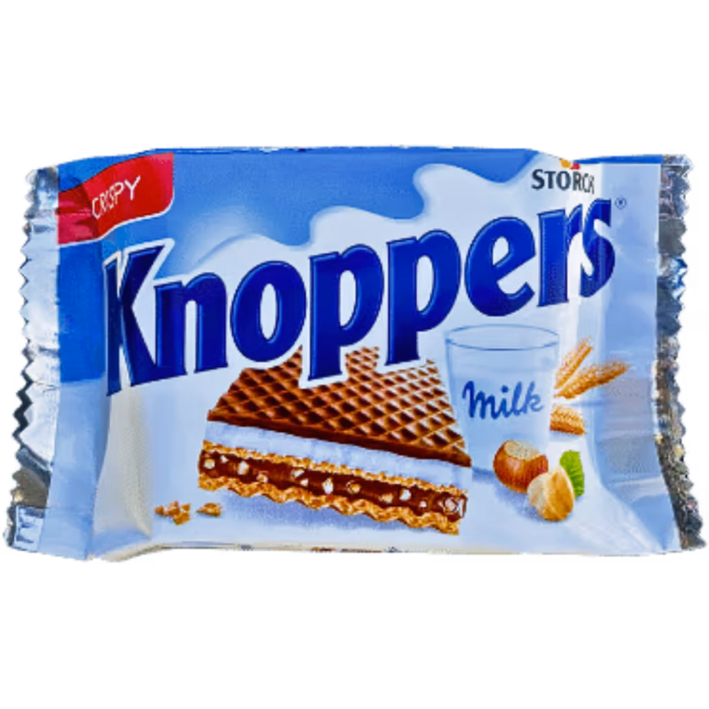 Knoppers er en populær snack som er bestående af sprød vaffel kombineret med blød mælkefyldning, lækker nougatcreme og knassende hasselnødder. Den er en perfekt balance mellem sprødhed og cremethed og er perfekt til et lille mellemmåltid i hverdagen.
